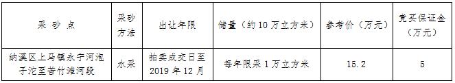 我公司受委托,于2017年4月6日上午10時在納溪區(qū)公共資源交易中心面向社會公開拍賣瀘州市納溪區(qū)上馬鎮(zhèn)永寧河泡子沱至苦竹灘河段采砂點的采砂權(quán)。具體事項公告如下: